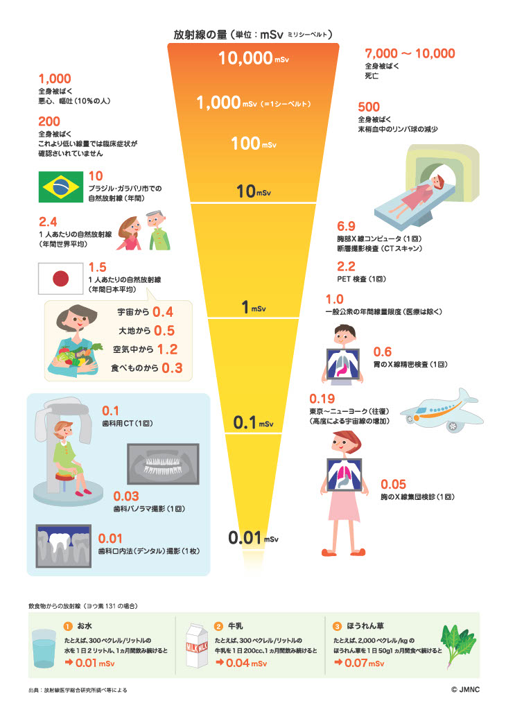 これらは自然放射線(年間1.5〜2.4 mSv)や長距離フライトの宇宙線(東京–NY往復 約0.2 mSv)と